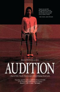 Moscow Film Society presents AUDITION as part of their Creeping Dread series. One of the most infamous, impactful, and gut-wrenching Japanese horror films ever made! A recent widower and film producer stages fake movie auditions to find a new wife, becoming enchanted with a mysterious young woman whose charm hides something far more unsettling. With Audition, Takashi Miike delivers a nerve-shredding exploration of male fears and the myth of submissive Japanese women, shocking audiences worldwide with its slow-burn build and white-knuckle finale while helping spark a new wave of Asian horror. Japanese with English subtitles.