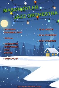 The Mason Oyler Big Band is back! Now known as the Mason Oyler Jazz Orchestra, the band is excited to bring a set of almost all brand-new arrangements, with a couple of old favorites. The Mason Oyler Jazz Orchestra is comprised of University of Idaho students and alumni playing all original compositions and arrangements by Mason Oyler. Tickets for the 20th are $7 for adults and $5 for students and children. Doors will open at 3:00pm for a 3:30 pm show. We hope to see you there!