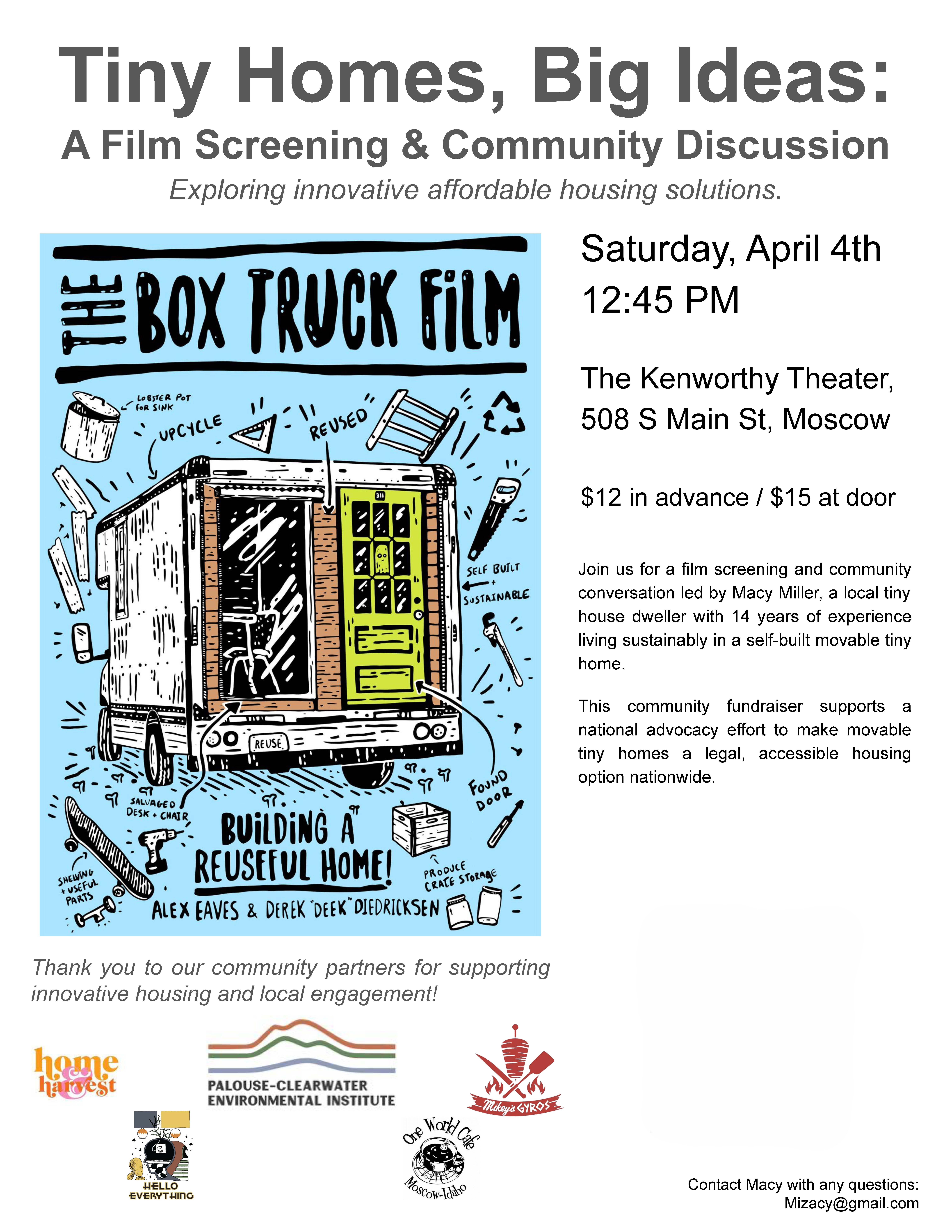 TINY HOMES, BIG IDEAS is a film screening of The Box Truck Film and a community discussion hosted by Macy Miller, a local tiny house dweller with 14 years of experience living sustainably in a self-built movable tiny home.